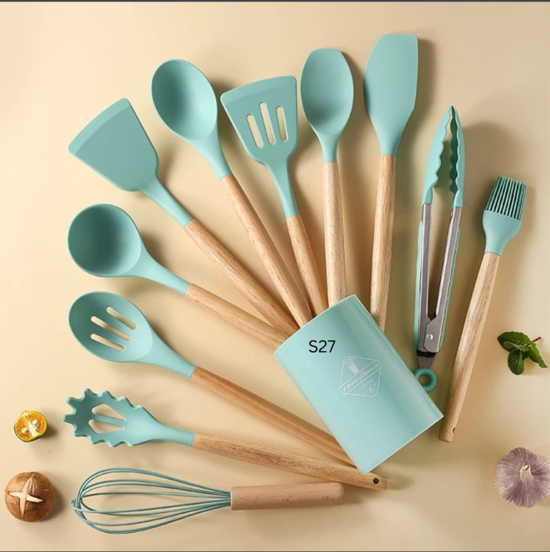 Elevate your cooking experience with this 12-piece silicone kitchen utensil set. Designed for durability and versatility, this set is made with BPA-free, food-grade silicone that withstands high temperatures without melting or warping. Each utensil features a sturdy wooden handle for a comfortable grip and a modern aesthetic. Perfect for all your cooking, baking, and serving needs, this set ensures non-stick cookware safety, making it a must-have for every kitchen.